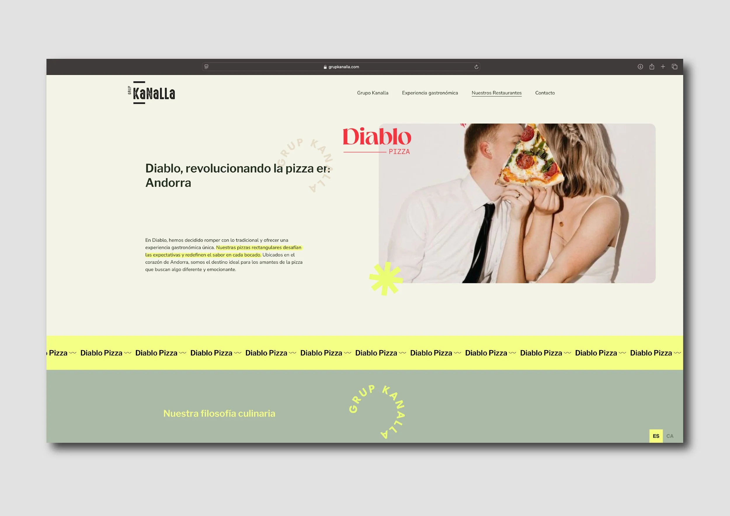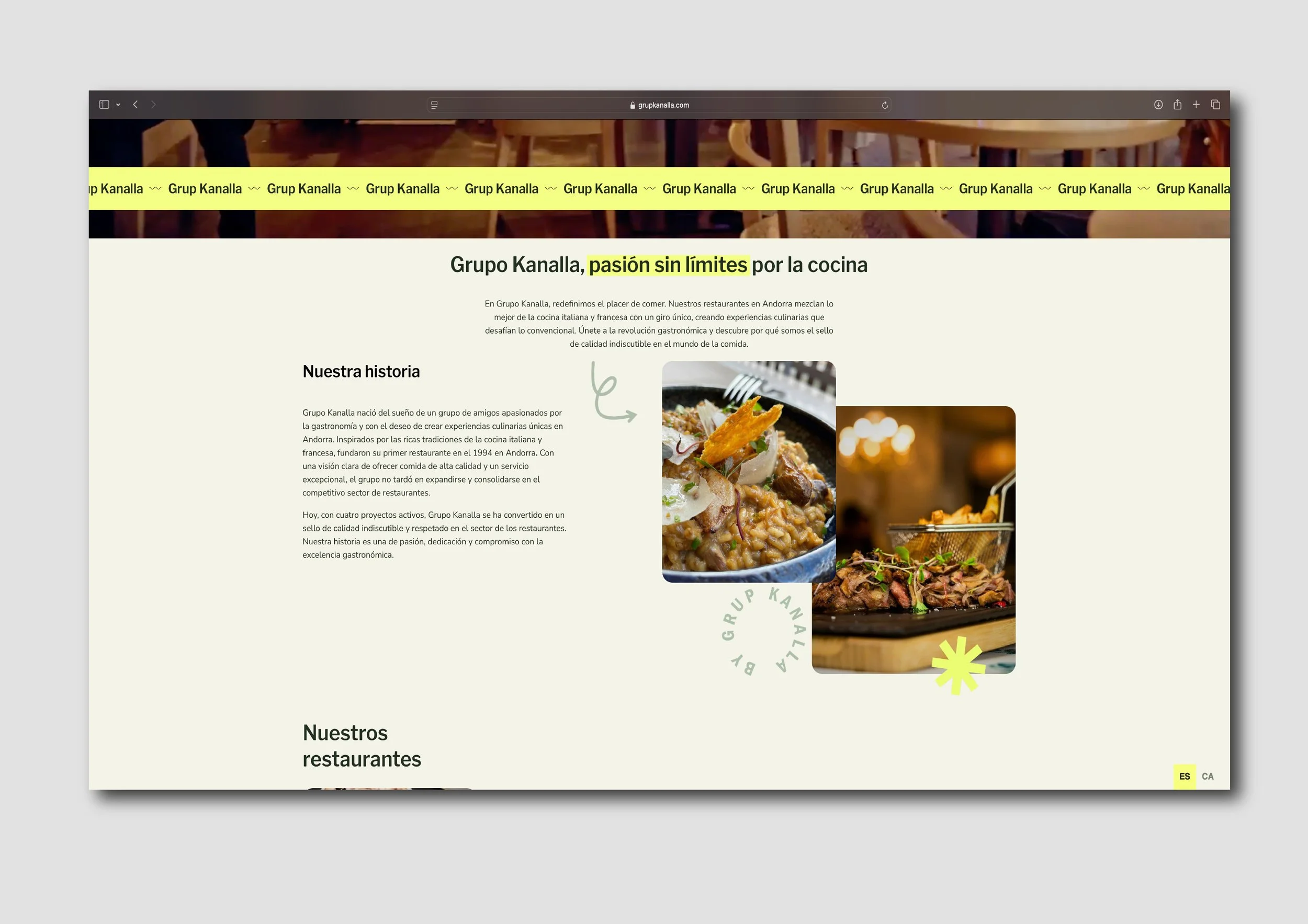 Diseño y creación web para Grup Kanalla, empresa de Andorra que lleva cinco restaurantes. El objetivo fue desarrollar un sitio web que reflejara la personalidad kanalla y dinámica de la marca para darlos a conocer. El proyecto ha consistido en crear una navegación intuitiva y una experiencia de usuario fluida con un diseño visual que asegure la coherencia estética y una dirección de arte alineada a la identidad de Grup Kanalla.